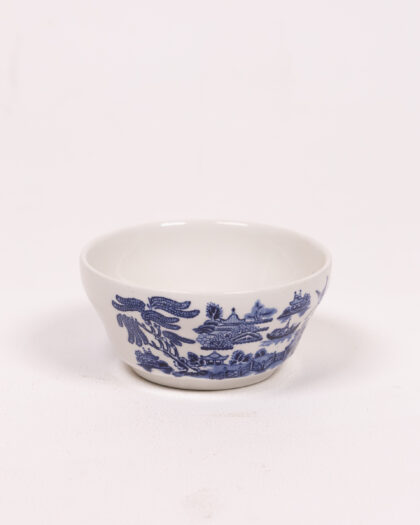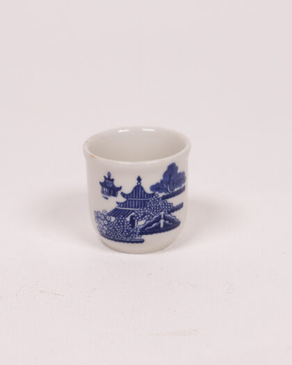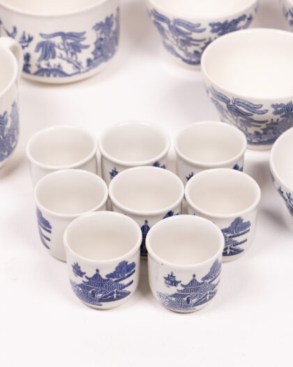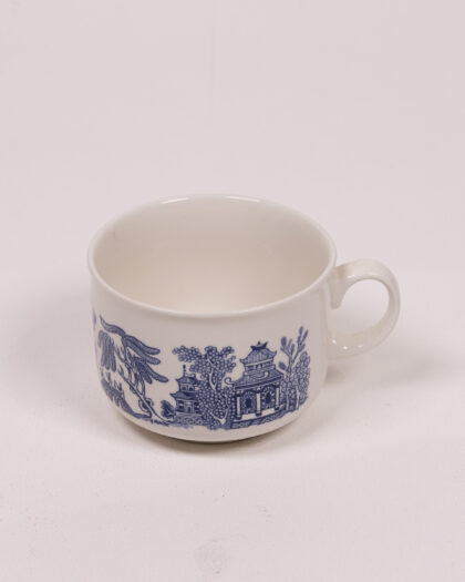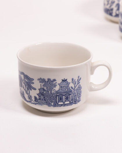 Vintage English ceramic cup collection with classic blue willow pattern. Includes tea, coffee, and espresso cup sizes. "Made in England".