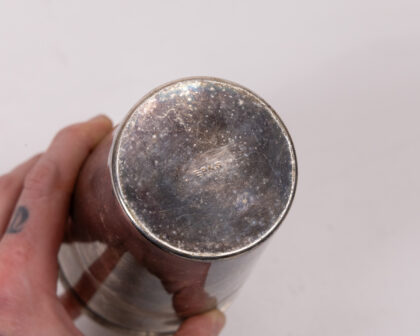Vintage cocktail shaker, stamped EPNS on the base. Classic design with a simple cylindrical body. Features bands around the midsection. Shows its age and use with some patination and wear, adding to its vintage charm. Ideal for home bars or collectors of vintage barware.
