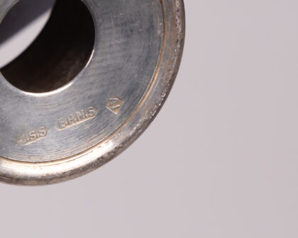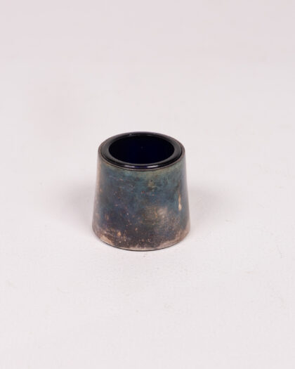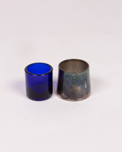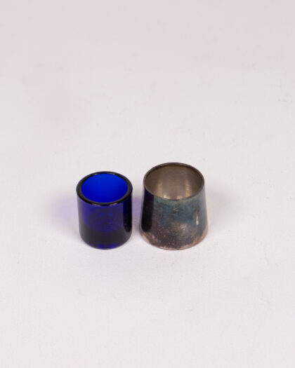This vintage egg cup features a metal exterior with an EPNS (Electroplated Nickel Silver) stamp. The interior has a blue glass insert. This provides an interesting visual contrast. It is in good condition. It will look good on display.
