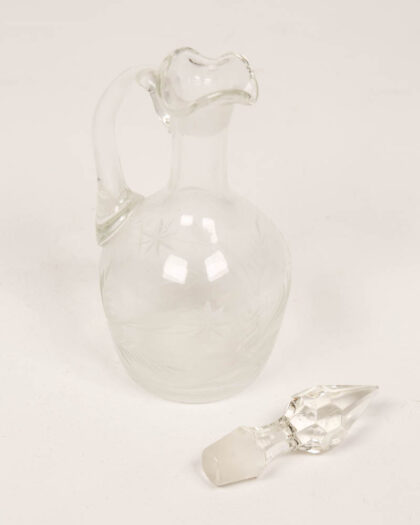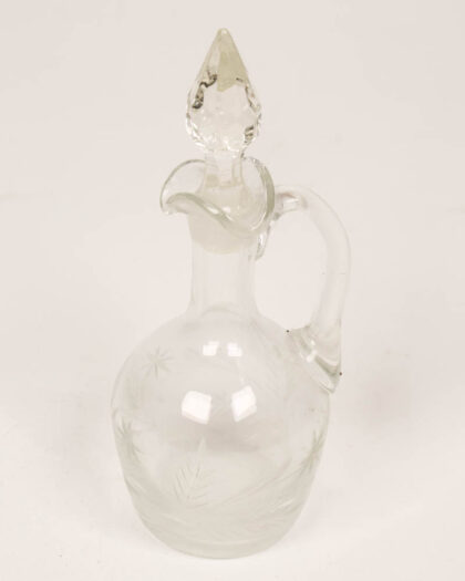 This is a clear glass decanter with a stopper and handle, dating to the mid-20th century. The glass body has a round shape and is decorated with etched leaf and star patterns. The handle is curved and applied to the body. The stopper is faceted and has a ground base to fit into the neck of the decanter.