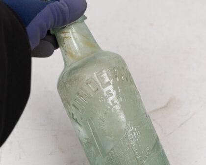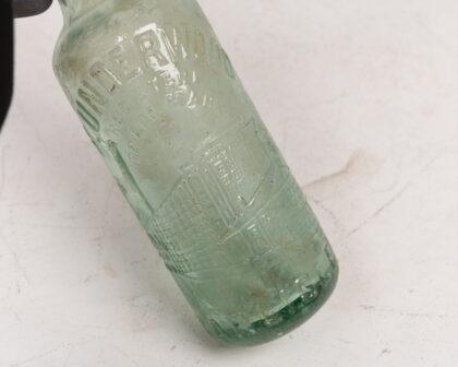 Vintage F. Underwood glass bottle with embossed building design. Light green glass, collectible bottle. Good condition for its age. Unique bottle for collectors.