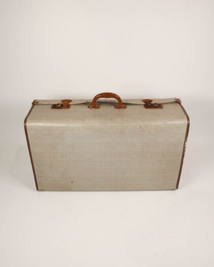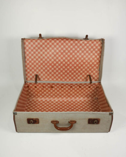 Vintage suitcase covered in textured grey fabric with brown leather handle and trim. Interior lined with orange and cream plaid fabric. Some wear to exterior.