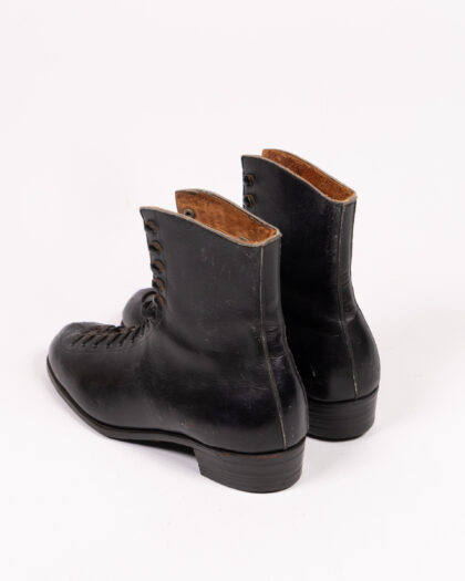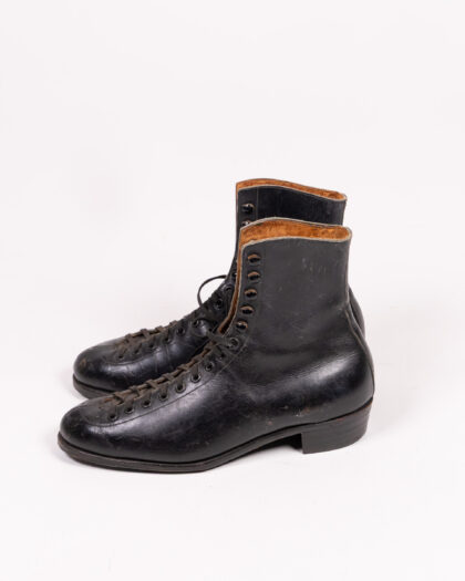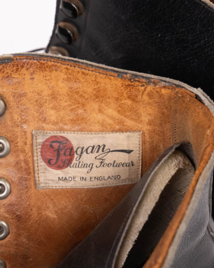 A pair of vintage Fagan boots 5. These skates are made of black leather, with a lace-up design and metal eyelets. The inside of the boot is lined with leather. The soles are leather. The skates show wear consistent with age and use, but are in good overall condition for their age. Made in England.