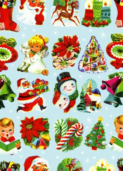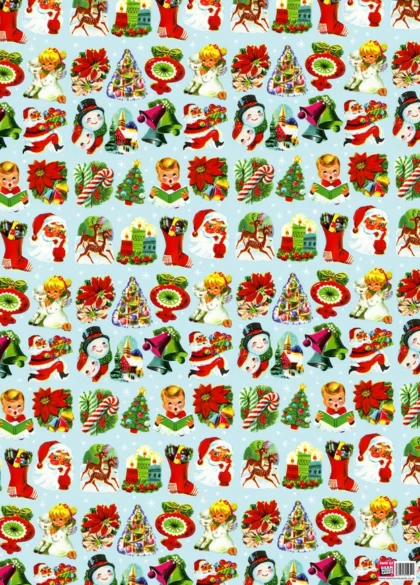 This is a sheet of Christmas wrapping paper that features a repeating pattern of classic Christmas images. The background colour is a light blue, and the pattern includes a variety of festive images such as Santa Claus, snowmen, Christmas trees, angels, candy canes, stockings and poinsettias, all with a vintage aesthetic. It's perfect for adding a festive and nostalgic touch to your Christmas presents. Some of the images have a charming retro style that adds to the overall appeal.
