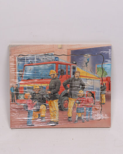 A vintage jigsaw puzzle featuring an illustration of a fire engine and a group of firefighters along with children. The puzzle is sealed in plastic wrap to keep it complete. A classic toy that can help develop problem-solving skills.