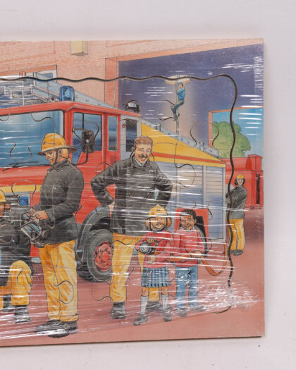 Vintage jigsaw puzzle featuring a fire engine and firefighters illustration. Great as a gift for a child.