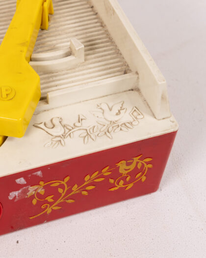 This is a vintage Fisher-Price Music Box Record Player. The main colours are red, yellow and white. The top part of the player is white. The record is yellow as is the arm. The base is red and has a design of leaves and birds in yellow. There is an on and off switch in yellow. This piece would make a great nostalgia gift for a child or a retro display item. The item is in good condition for its age, but there is some wear and tear on the base.