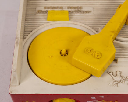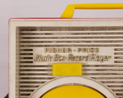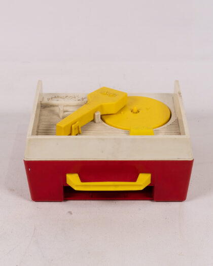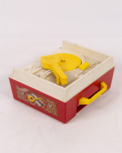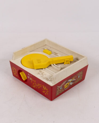 Vintage Fisher-Price Music Box Record Player in red, yellow, and white, a nostalgic toy or display item!