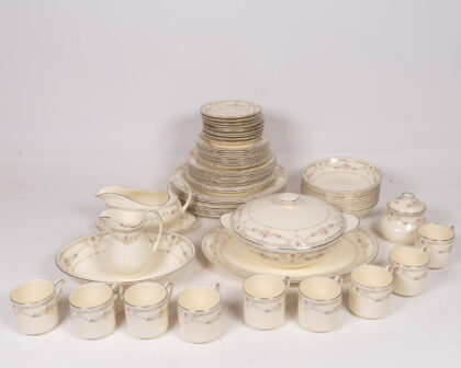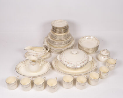 This is a large vintage dinnerware set, featuring a delicate floral pattern with pink and peach roses accented by silver trim. The set includes dinner plates, salad plates, bowls, cups, saucers, a lidded tureen, a gravy boat with saucer, and a sugar bowl with lid. The creamy ivory background enhances the floral design. All pieces are in good vintage condition, with some signs of age and use visible upon close inspection. This set is ideal for special occasions or adding vintage charm to everyday dining.