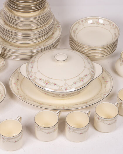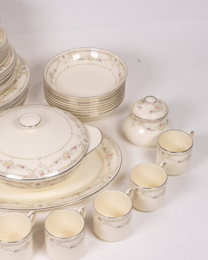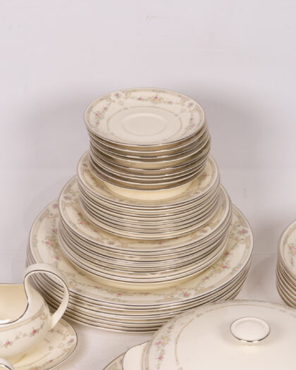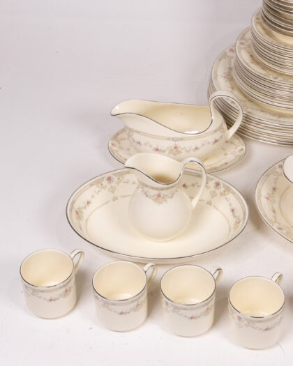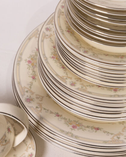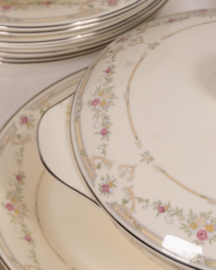 Vintage floral dinnerware set with silver trim. Includes plates, bowls, cups, serving pieces. Great for adding elegance to any dining occasion.