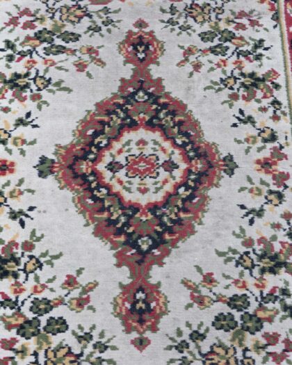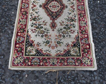 This is a vintage small area rug featuring a floral pattern in red, green, and cream colours. The rug shows some signs of age and wear. The rug has a central diamond pattern as well. It could be a great addition to your house.
