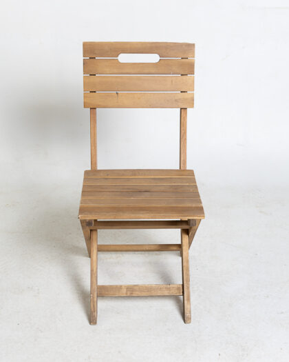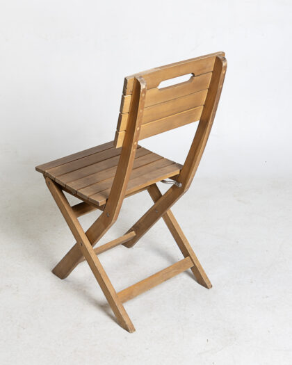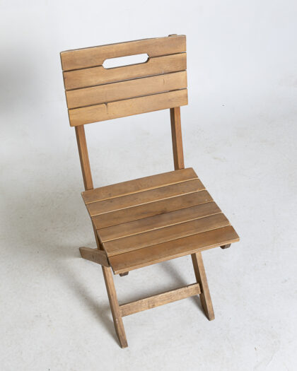 This is a vintage folding wooden chair. This portable chair features a slat seat and backrest. The light brown wood finish adds a rustic touch. Ideal for indoor or outdoor use. Its folding design allows for easy storage and transport. There are some signs of wear and tear on the legs and edges. It is structurally sound and ready for use. Perfect for small spaces, patios, or as extra seating when needed. The chair is lightweight and easy to carry. The seat has horizontal slats. The back also has horizontal slats and a carry handle cut out for ease of use. The folding mechanism is in good working order.