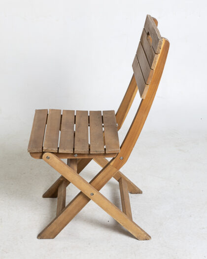 Vintage folding wooden chair. Portable slat seat and backrest. Light brown finish. Ideal for indoor/outdoor use. Great for small spaces, patios, or extra seating.