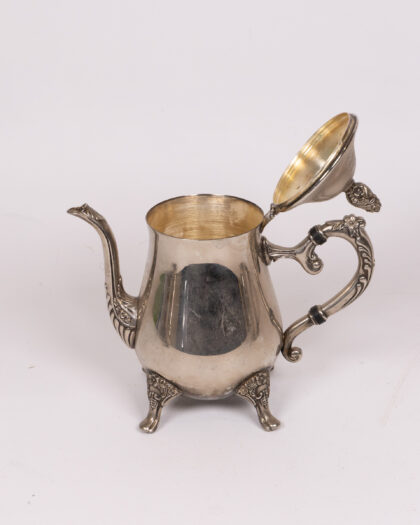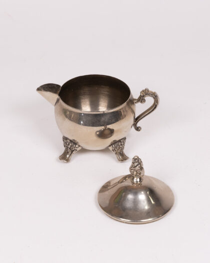 Vintage silver-toned tea & coffee service set with ornate handles, finials and legs. Includes teapot, coffee pot, sugar bowl & milk jug.