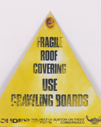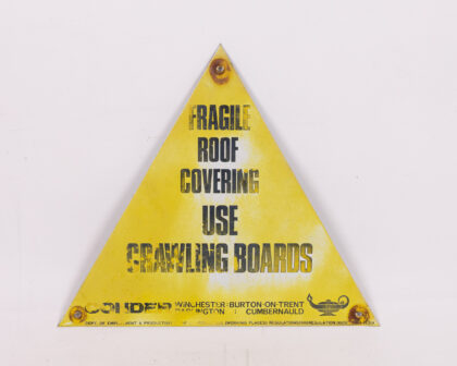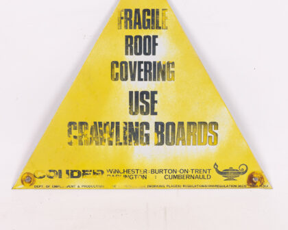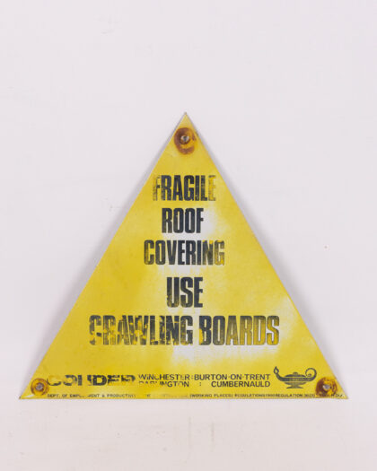 This vintage sign warns of fragile roof coverings and the use of crawling boards. Made from metal and painted yellow with black lettering. The sign has holes for fixing. There is age-related wear and tear including rusting to the metal, marks and scratches to the painted surface, see images for condition.