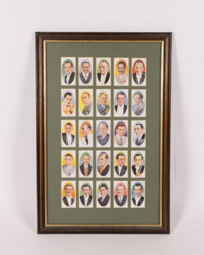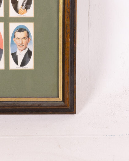 Framed vintage cigarette card collection of dance band leaders. Classic wooden frame, perfect for collectors & vintage home decor. Good condition.