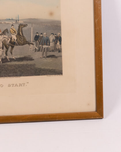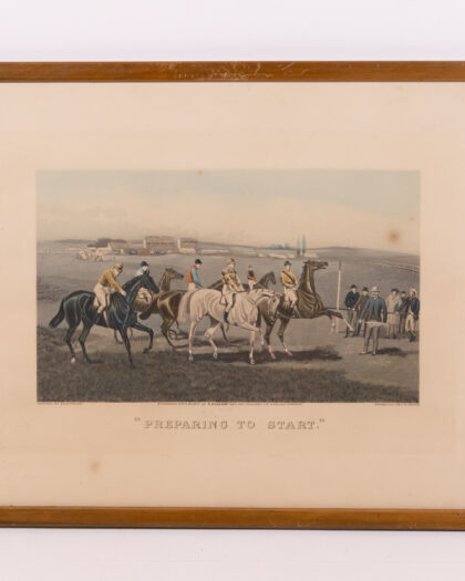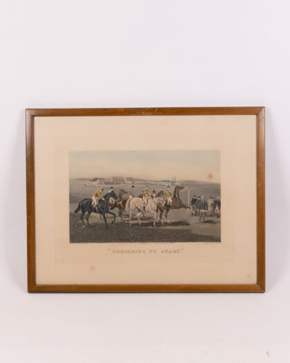Framed print entitled "Preparing to Start", which depicts a group of horses and riders preparing for a race. The print is signed by E.P. Walsh and C.H. Jeens. The print is in good condition for its age. The frame is made of wood and has a dark brown finish. There are some signs of age and wear to the frame. This decorative piece would make a great addition to any home.