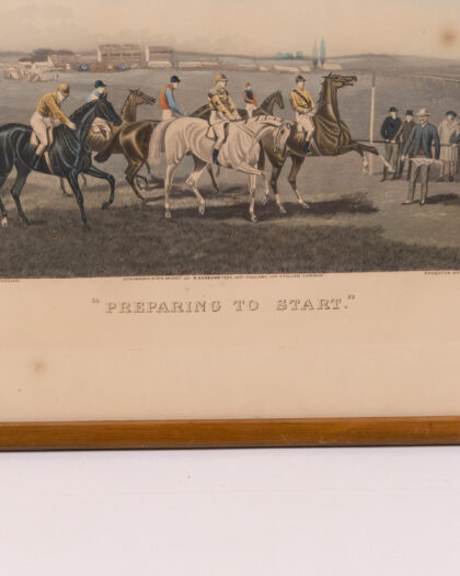 Vintage framed print of racehorses "Preparing to Start" by E.P. Walsh and C.H. Jeens in good condition. Perfect for a traditional home.