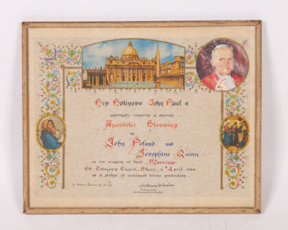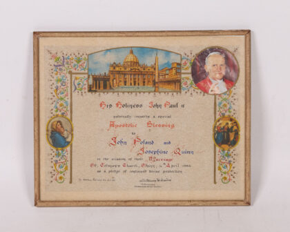 This framed print commemorates the marriage of John Foland and Josephine Quinn at St. Colman's Church, Shinn, in April 1966. It bears an Apostolic Blessing from His Holiness John Paul II, indicated by the inscription. The print features an image of St. Peter's Basilica at the top, and portraits of Pope John Paul II, the Virgin Mary with Child, and the Holy Family (Jesus, Mary, and Joseph). The frame has a light gold colour, typical of the period. The print shows some light discolouration and foxing but is overall in good condition. The frame is structurally sound and suitable for wall display.
