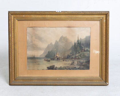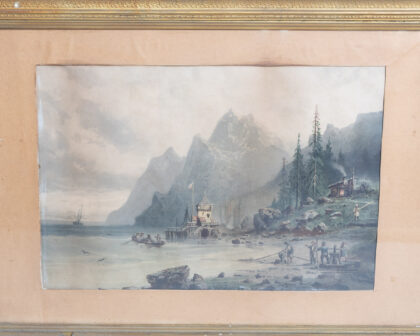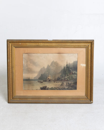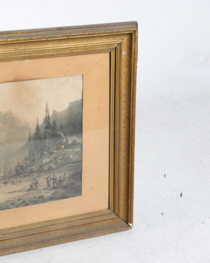 Vintage watercolour painting featuring a tranquil mountain scene with figures, buildings, and boats. The painting is framed in a decorative gold-coloured frame, showing signs of age with some wear and tear. The artwork itself is in good condition, capturing a detailed landscape. Ideal for collectors or those seeking vintage wall decor.