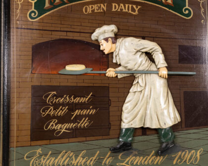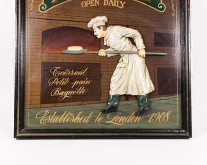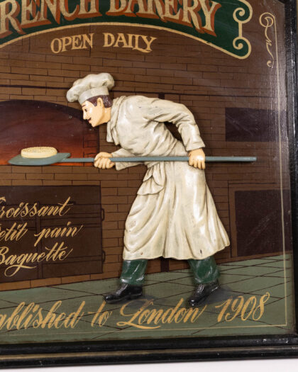 Vintage French Bakery sign. Charming wall art featuring a baker and oven. "Established in London 1908." Good condition, unique decor piece.