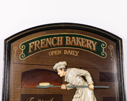 This vintage French Bakery sign is a charming piece of wall art. The sign depicts a baker tending to an oven with "Croissant Petit pain Baguette" inscribed below. The colour palette includes brown, cream, green, and black, with the text "French Bakery Open Daily" featured at the top. A unique addition to any kitchen or bakery-themed decor. In good condition considering its age, with some wear and minor imperfections that enhance its vintage appeal. The sign is framed with a black border.