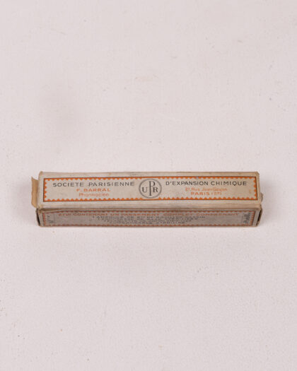 This is a vintage "PRORIDON-PANSEMENT" medical dressing kit in its original paper box. The box features printed text in French, including "SOCIETE PARISIENNE D'EXPANSION CHIMIQUE" and details about the contents: "ETUI CONTENANT UN PANSEMENT COMPLET COMPRENANT..." followed by a list of sterilized items. The box is intact but shows signs of age and wear, consistent with its vintage nature. The colours are primarily white and orange, with black lettering. A piece of medical history in original condition.