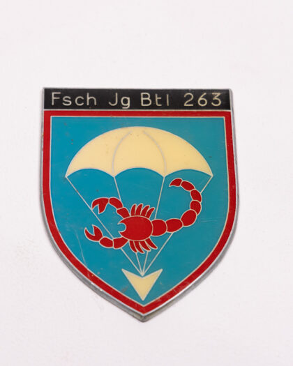Vintage German Fsch Jg Btl 263 military badge, featuring a shield design with a red scorpion and parachute motif. Perfect for military history collectors.