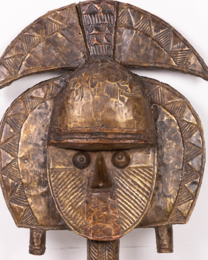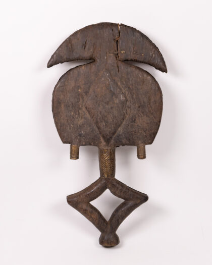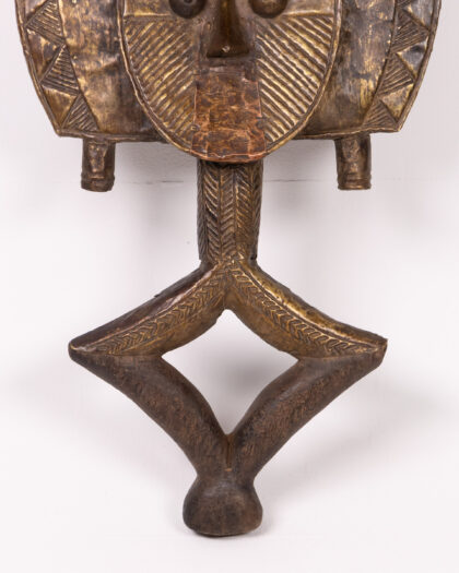 This is a vintage Kota reliquary guardian figure from Gabon, Africa. These figures were placed on baskets or boxes containing the bones of ancestors. The figure is constructed from wood and bronze. The metal face is decorated with geometric patterns. The figure features a stylised face with small eyes, a nose, and a mouth. The body is a simple, diamond shape. The wood has a dark brown patina with wear consistent with age and tribal use. This figure would make a striking addition to any collection or displayed in a living room.
