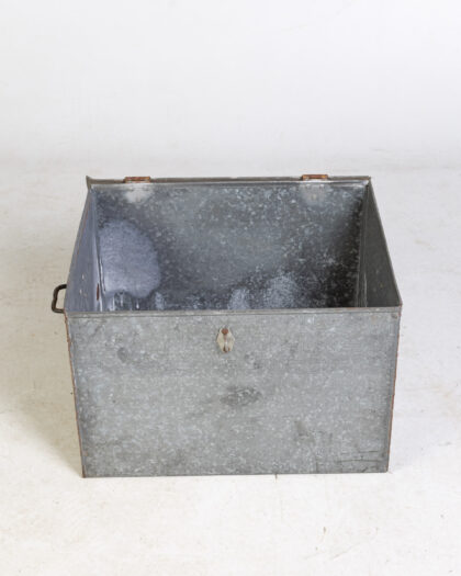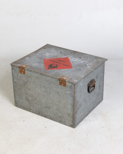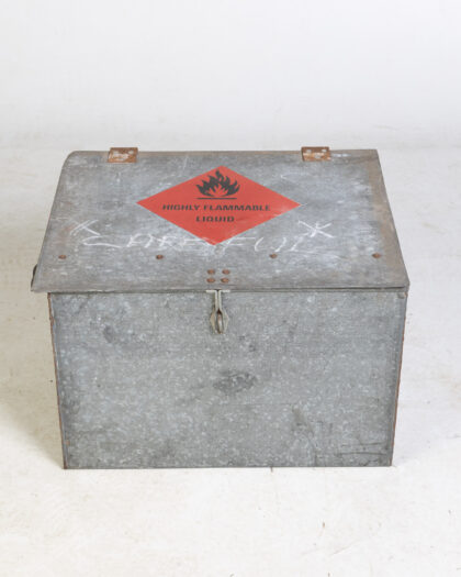 This is a vintage galvanised metal storage box, originally designed for storing flammable liquids. The box features a red 'Highly Flammable Liquid' sticker on the lid. It has metal handles on the sides for easy carrying and a metal clasp on the front to secure the lid. The galvanised finish shows signs of wear and age, with some rust around the hinges and slight dents, adding to its industrial charm. The box has lettering scratched into the surface. Inside, the box shows signs of age and use. This sturdy box is perfect for adding a touch of vintage industrial style to any space and provides secure storage.