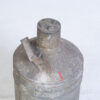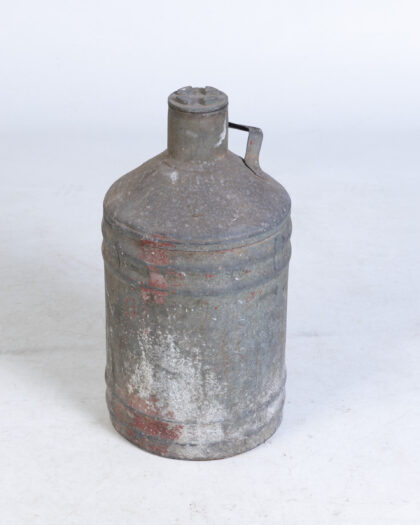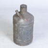 This is a vintage galvanised metal oil or fuel canister. The main colour is grey with some distressed red paint markings adding to its authentic vintage look. The canister features a cylindrical body with a rounded top, a small spout with a cap, and a sturdy metal handle. The metal shows signs of age and wear, with some rust and discolouration, enhancing its vintage charm. The canister is structurally sound and would make a great display piece for a garage, workshop, or home.