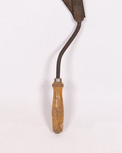 Vintage garden tool with curved blade and wooden handle. Ideal for gardening enthusiasts or collectors of vintage tools.