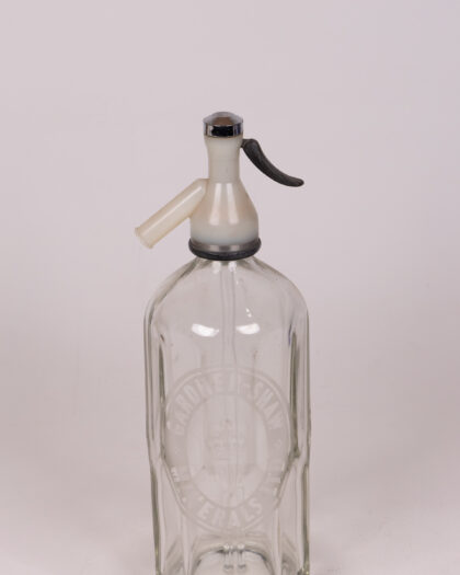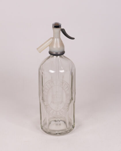 Vintage Gardner-Shaw clear glass soda siphon, metal top, black lever, good condition, home bar decor. A classic bar accessory.