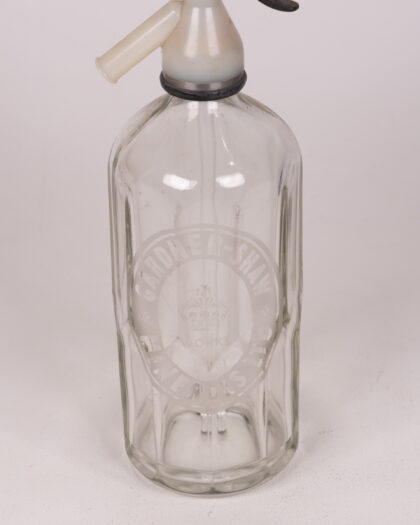 This is a vintage Gardner-Shaw clear glass soda siphon. The glass is embossed with the brand name. The siphon features a metal top with a black plastic lever and a clear plastic spout. This vintage piece would make a great addition to a home bar or a unique decorative item. The glass is in good condition, with minor signs of wear commensurate with age.
