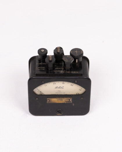 Vintage GEC (General Electric Company) F.G. meter housed in a robust leather case. The meter features a black metal body with a clear analog display, marked with "GEC F.G." The meter has multiple terminals for various electrical measurements. The leather case shows wear consistent with age, adding to its vintage charm. The back of the meter has detailed specifications and instructions engraved on a brass plate. Untested. Sold as seen.
