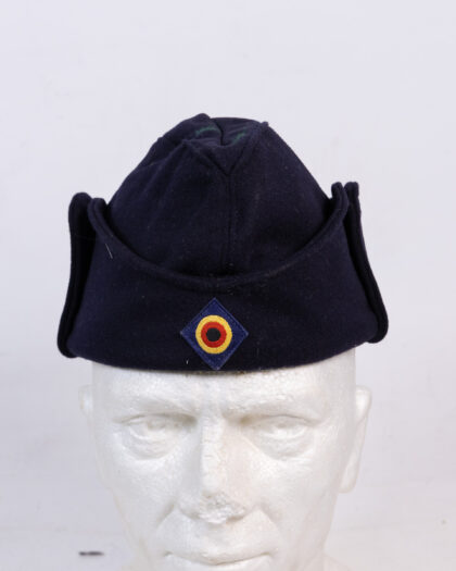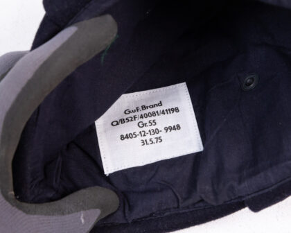 Vintage German Navy blue wool cap with ear flaps and cockade badge, marked 'G.u.F. Brand' with date of 31.5.75. Collectible military headwear.