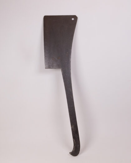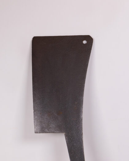 Vintage butcher's cleaver. Likely from the early to mid 20th century. The cleaver has a rectangular head with a hole for hanging. The handle is curved for easier grip. The metal is dark in colour, indicating possible carbon steel. In good condition, with signs of age and use visible. Ideal for use or as a decorative item.