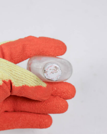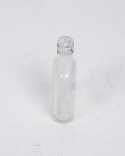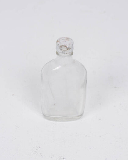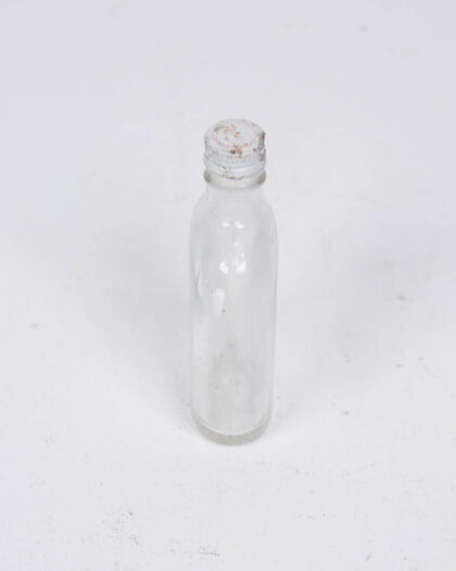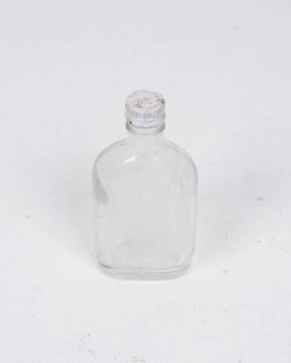 Small, clear glass bottle with a screw top. The metal lid has a faded design and slight wear. Perfect as a decorative bottle.