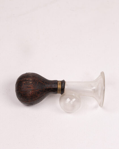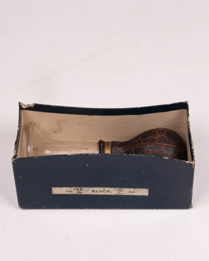 A vintage breast pump featuring a glass collection chamber and a rubber suction bulb. The bulb shows cracking consistent with age and use. The connecting band appears to be brass. Overall, it is a well-preserved example of early 20th-century medical technology. 'FIG. 2. BLACK 9 oz' shown on original packaging. This piece offers a glimpse into the history of infant care and medical practices. The pump is an antique item and it is not sold for medical use.