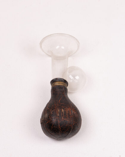 Vintage glass and leather breast pump with brass connector. Includes original box labelled 'FIG. 2 BLACK 9 oz.' Good condition for age.