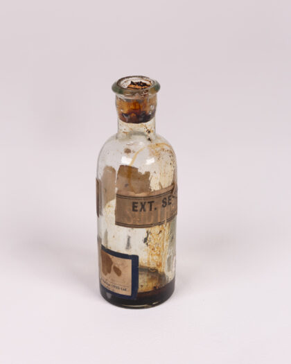 Vintage glass medical bottle with aged label and cork stopper. Showing signs of wear consistent with age. Perfect for collectors.