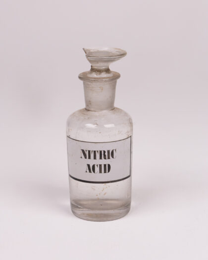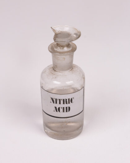 Vintage glass bottle with 'Nitric Acid' label. Some age-related wear, chip on stopper. A unique scientific collectible.