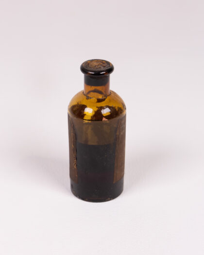 Vintage amber glass apothecary bottle from Lescher & Webb. The bottle is marked 'Ol. Cassiae'. The bottle is in fair condition, with wear to the label and some staining on the glass. The bottle is approximately 10 cm in height and 5 cm in diameter. This bottle would make a great addition to any collection of medical memorabilia.