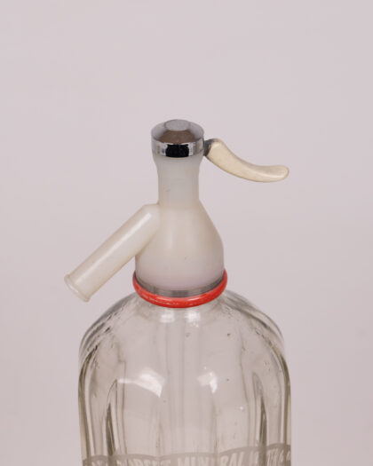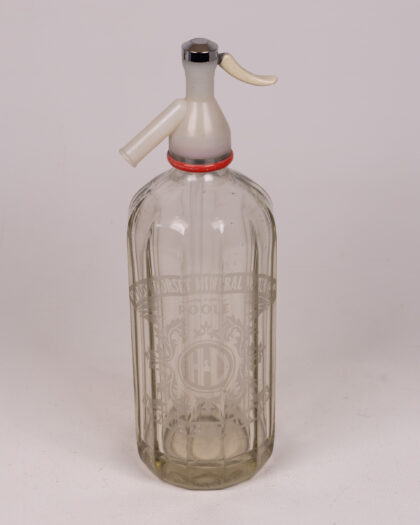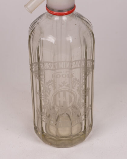 Vintage 'H&D Dorset Mineral Waters Poole' glass soda siphon. The glass body features an etched company logo and text. Top is chrome with a white plastic nozzle and lever. A red band separates the top and the bottle. This soda siphon shows its age, with minor wear and discolouration to the plastic parts and some slight clouding inside the bottle, but is in otherwise good condition considering its age and use.