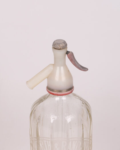 This is a vintage glass soda siphon by North & Rawling Les Bains. It features a clear glass bottle, with white plastic top and nozzle, and a metal lever mechanism. A thin red ring encircles the neck of the bottle. It is in good condition, although the metal parts show some wear and discolouration.