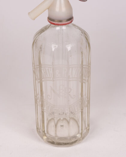 Vintage North & Rawling Les Bains glass soda siphon with metal lever. In good condition, signs of wear.