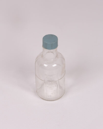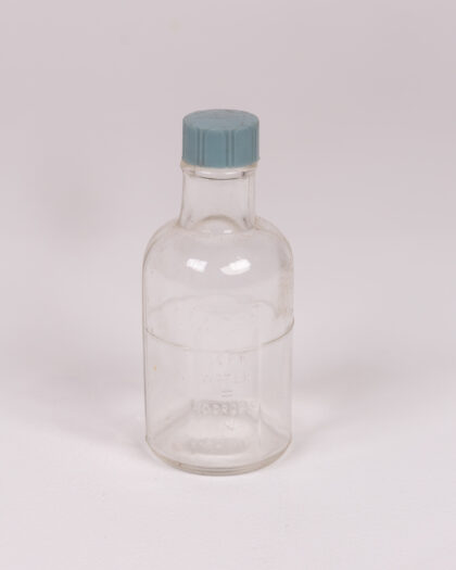 Vintage clear glass bottle with blue plastic lid, embossed with 'Soft Water Ho Props'. Great vintage condition.