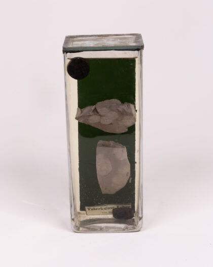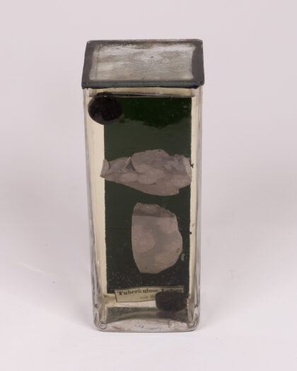 Antique glass jar containing a pathological specimen of a tubercular lung. The specimen is preserved in fluid and shows obvious signs of the disease. A paper label in German is attached to the front of the jar. The jar has a glass lid. Condition is consistent with age, including bubbles and imperfections in the glass and some residue within the fluid. Great for medical display.