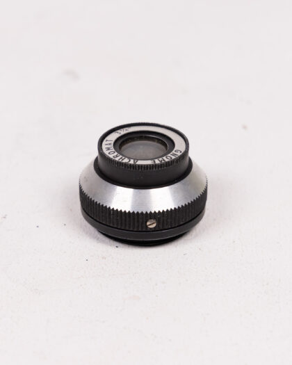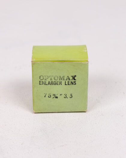 Vintage Gnome Optomax Enlarger Lens with original box. The lens is metal with a silver finish. The box is green. The lens measures 3 1/4". The box is labelled "OPTOMAX ENLARGER LENS, 75mm" . This would make a lovely display item for a vintage camera enthusiast. The lens is in good condition for its age. The box shows some signs of age and wear. This item has not been tested, we cannot verify if it is working or not and is sold as a prop only.