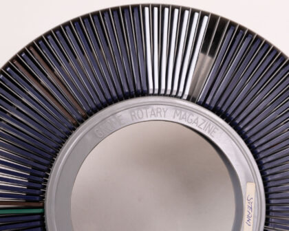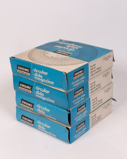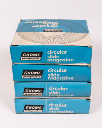 Vintage Gnome Photographic circular slide magazine in original box. Holds 122 slides. Retro photographic accessory for collectors.